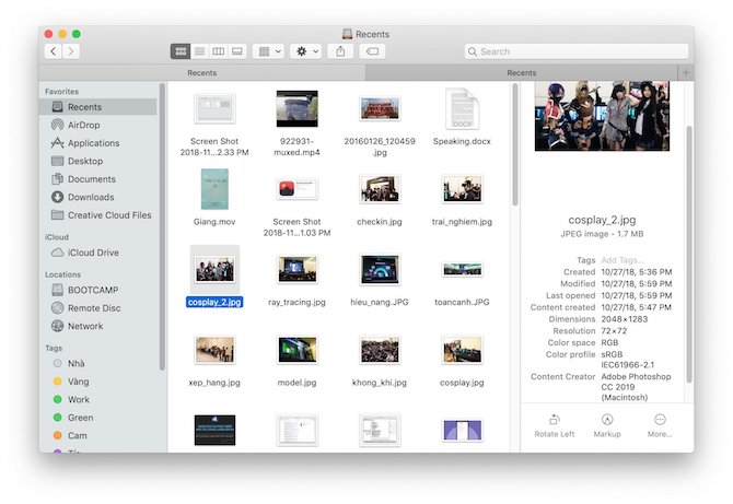 Sidebar là cột thông tin bên phải khi duyệt file nào đó. Cái hay của nó là cho phép chúng ta xem được rất nhiều thông tin mà không cần phải dùng thêm bất kì ứng dụng bên thứ ba nào. Sidebar phát huy tác dụng tốt nhất khi sử dụng chế độ xem Gallery như mình đã nói ở bên trên. Khi chỉnh xong thì mỗi khi click vào file nào thì nó sẽ tự động hiện ra những thông tin cụ thể về file đó ở Sidebar.