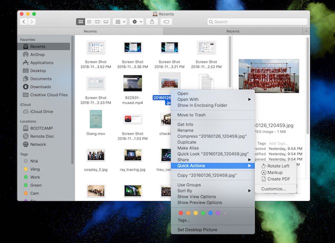 Quick Action làm việc hoàn hảo khi kết hợp với Sidebar, được tích hợp trực tiếp bên dưới. Quick Action, đúng như cái tên của nó cho phép thao tác rất nhanh xoay hình ảnh, thêm thắt, chỉnh sửa nhẹ hình ảnh hoặc tạo file PDF. Mặc định, không cần phải làm gì để bật Quick Action cả, khi duyệt file ở chế độ Gallery thì nó đã có sẵn ở bên dưới mỗi sidebar rồi, hoặc cũng có thể click chuột phải rồi chọn Quick Action.