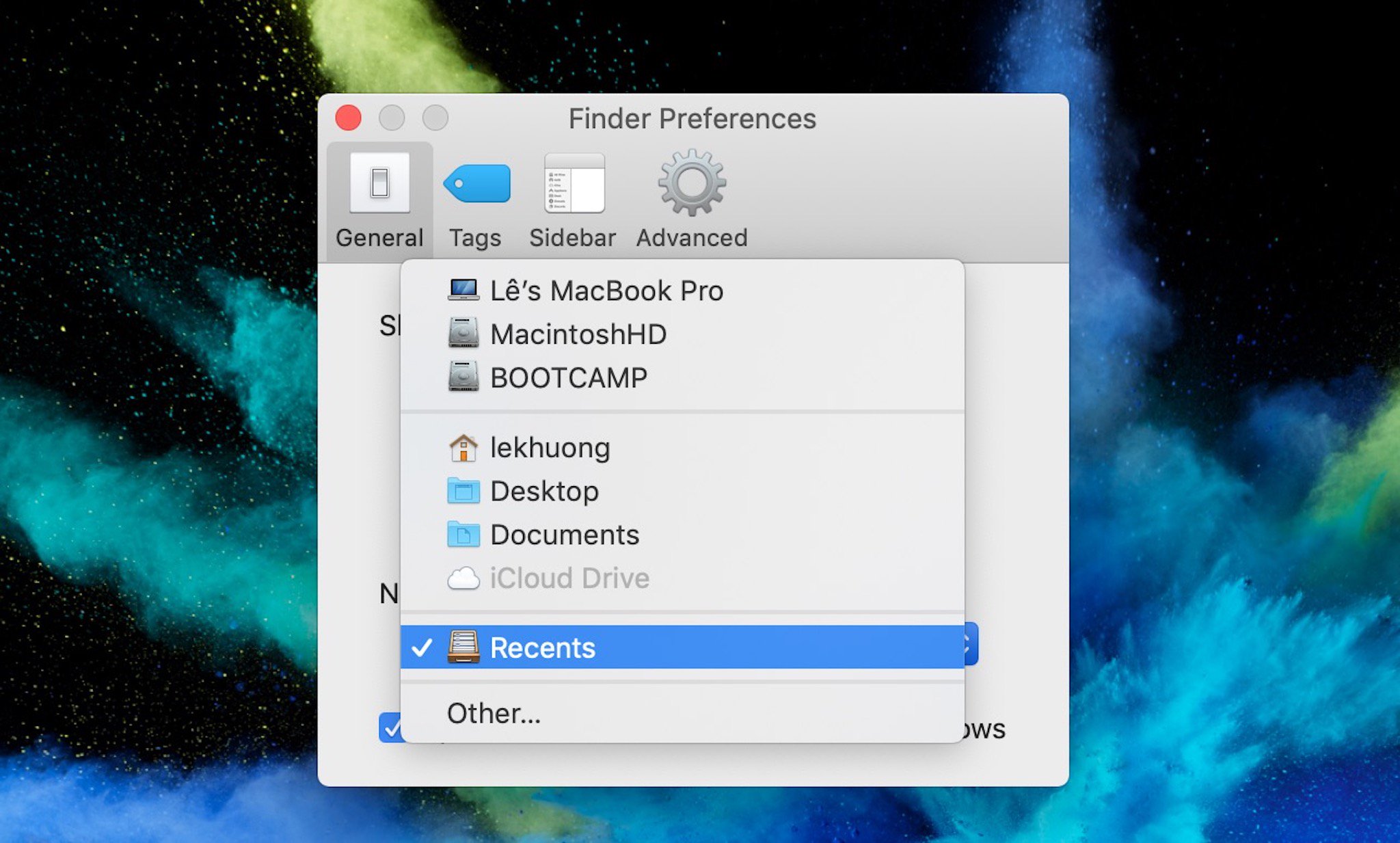 - Bấm vào để nó sổ ra các tuỳ chọn khác, lúc này chỉ cần tới thư mục mà mình muốn mở mỗi khi chạy Finder mà thôi