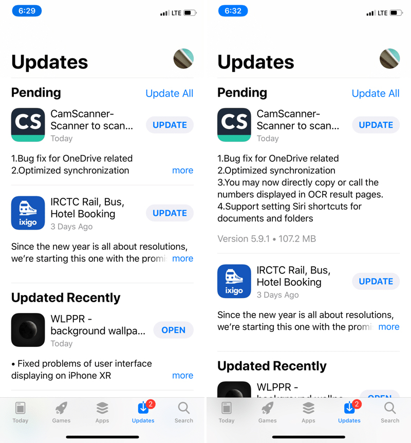Đối với điều này, có tab Cập nhật trong App Store. Mở ứng dụng App Store và nhấn vào tab Cập nhật. Tại đây bạn sẽ thấy một danh sách tất cả các ứng dụng có bản cập nhật có sẵn. Bạn có thể dành thời gian để đọc ghi chú phát hành ứng dụng để xem có gì mới trong bản cập nhật. Chạm vào nút Thêm để mở rộng mô tả ghi chú phát hành.