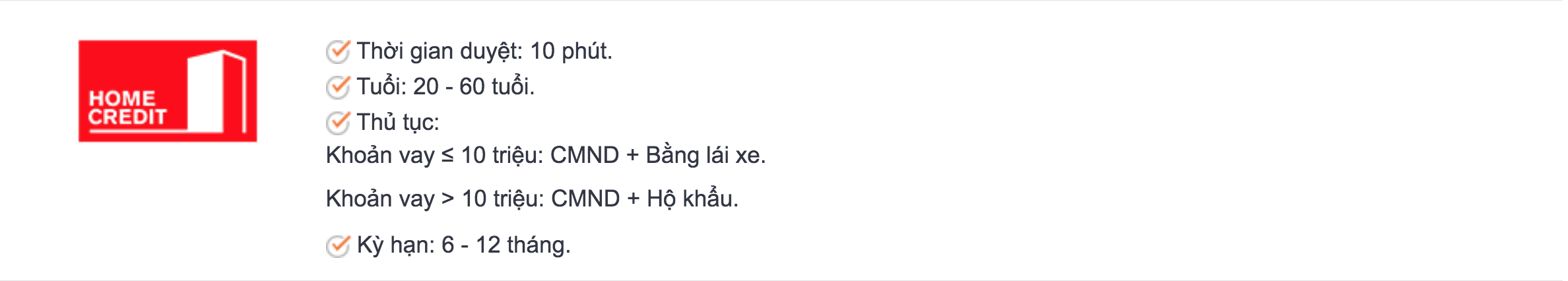 - Điều kiện vay: Khách hàng từ 20-60 tuổi, Có hộ khẩu tại những tỉnh thành có văn phòng của Home Credit. Không có nợ xấu tại bất cứ tổ chức tín dụng nào