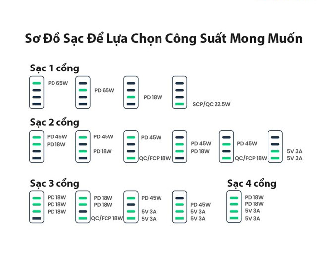 Củ sạc sẽ phân bố có số W khác nhau trên mỗi cổng: Type-C (Cổng 1,2) 65W, Type-C (Cổng 3) 18W, Type-A (Cổng 4) 22.5W. Khi sạc nhiều cổng cùng 1 lúc thì số W trên mỗi cổng sẽ hỗ trợ nguồn điện khác nhau. (Sơ đồ sẽ có ở dưới mục lưu ý)