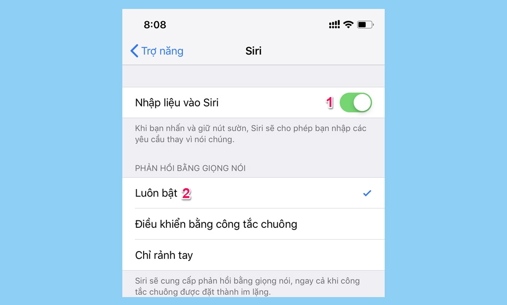 B2: Trong mục cài đặt Siri, bạn kích hoạt chức năng Nhập liệu vào Siri (nếu không muốn nhập bằng tay thì không cần bật chức năng này) và chọn Luôn bật với Phản hồi bằng giọng nói