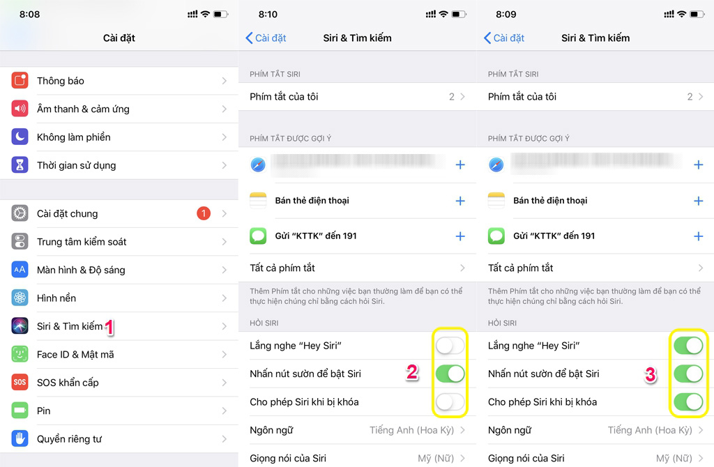 B3: Quay về trang Cài đặt ban đầu > truy cập vào mục Siri & Tìm kiếm > kích hoạt chức năng Lắng nghe "Hey Siri"; Cho phép Siri khi bị khóa; Nhấn nút sườn để bật Siri