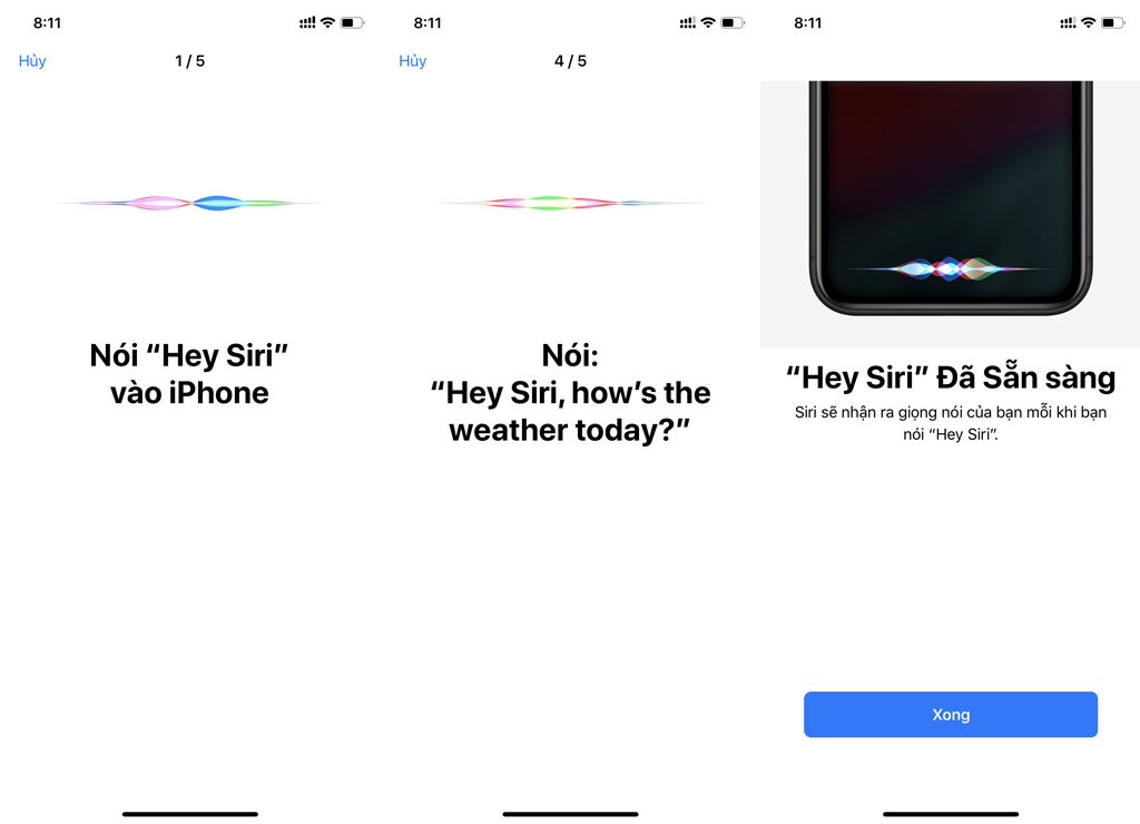 Lưu ý: Khi kích hoạt chức năng Lắng nghe "Hey Siri" bạn cần hoàn tất quá trình huấn luyện nói và nhận diện âm thanh cho Trợ lý ảo Siri, không cần phát âm chuẩn tiếng Anh mà nói to và rõ ràng là được.