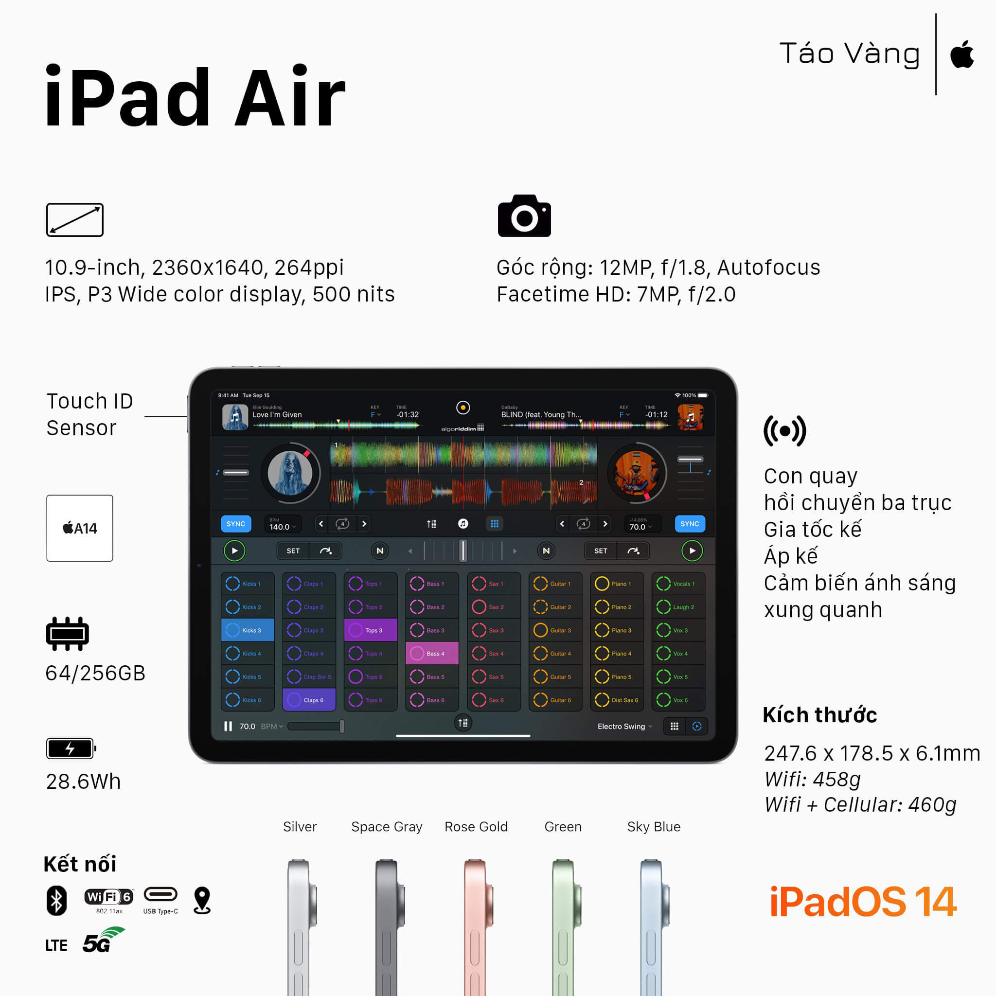 iPad Air mới hỗ trợ bút Apple Pencil 2, đồng thời phụ kiện bàn phím Smart Keyboard Folio và Magic Keyboard của phiên bản iPad Pro 11 (2020). Máy cũng có kết nối Wi-Fi 6, Bluetooth, tuỳ chọn LTE, 2 mức bộ nhớ lưu trữ 64 GB và 256 GB.