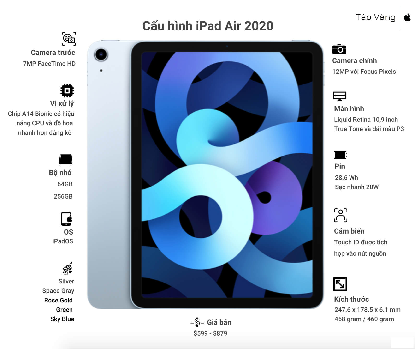 Cuối cùng là giá của iPad Air khởi điểm là 599 USD sẽ bắt đầu được bán ra từ tháng 10/2020. Chi tiết cụ thể các phiên bản như sau: