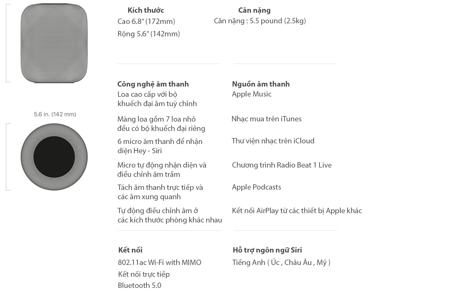 Theo Apple, HomePod được trang bị vi xử lý A8, gồm 7 loa vệ tinh và 1 loa âm trầm cho âm thanh 360 độ. Hệ thống 6 microphone vừa để nhận lệnh từ người dùng vừa giúp HomePod tự điều chỉnh chế độ phát nhạc tùy thuộc vào môi trường xung quanh.