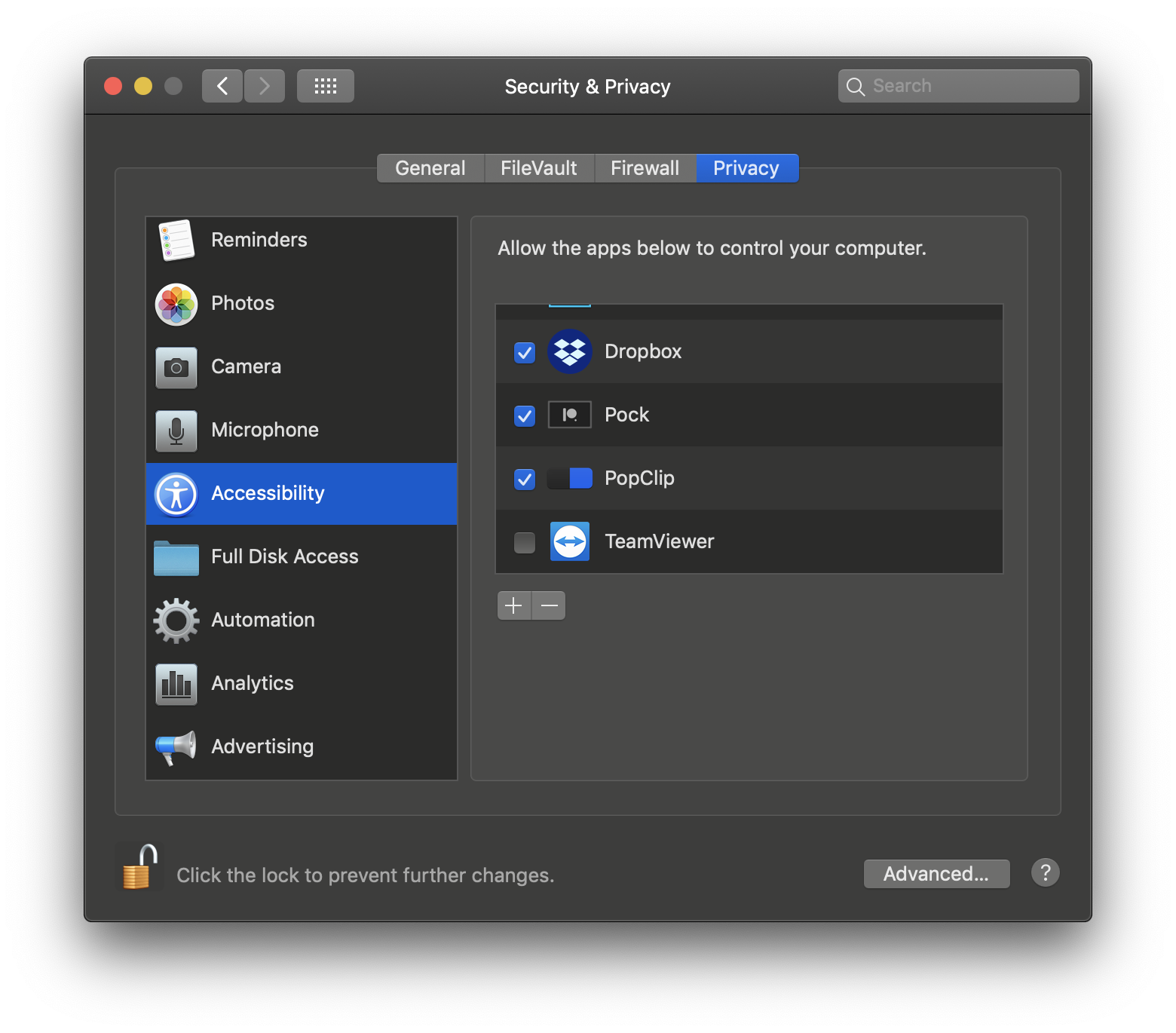 Lưu ý: Vì Pock là ứng dụng của bên thứ ba lập trình, chính vì vậy sau khi download MacBook sẽ không cho phép bạn cài đặt. Đơn giản chỉ việc vào System Preferences - chọn Security & Privacy - chọn Privacy - chọn vào mục Accessibility - tick vào Pock (như hình dưới) là xong.
