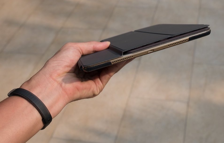 Khi bàn phím gấp vào trong thành cái cover bảo vệ màn hình của iPad. Phần bàn phím là phần tiếp xúc với mặt bàn nên khi gấp lại anh em nhớ kiểm tra, tránh cát làm trầy màn hình.