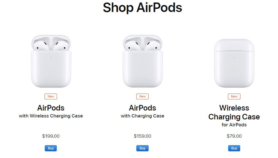 Apple AirPods 2 mới có giá khởi điểm là 159 USD với hộp sạc tiêu chuẩn. Đối với trường hợp sạc không dây, giá tăng llên 199 USD. Hộp sạc không dây cũng có thể được mua riêng với giá 79 USD.