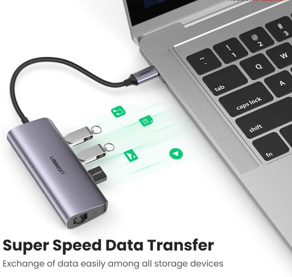 Bộ chia Ugreen 60718 có 3 cổng USB 3.0 để đồng bộ nhanh: Bộ chuyển đổi ethernet hub USB C hỗ trợ siêu tốc độ lên đến 5 Gbps, truyền một bộ phim HD trong vài giây. 3 cổng USB 3.0 Hub bổ sung đơn giản giúp kết nối nhiều phụ kiện hơn như chuột, bàn phím, Ổ đĩa ngoài, Ổ đĩa ngón tay cái với cổng USB A truyền thống, hỗ trợ đồng bộ hóa dữ liệu lên đến 5Gbps, biến nó trở thành Hub Loại C rất thiết thực và hữu ích cho bạn, hoàn hảo để sử dụng hàng ngày.