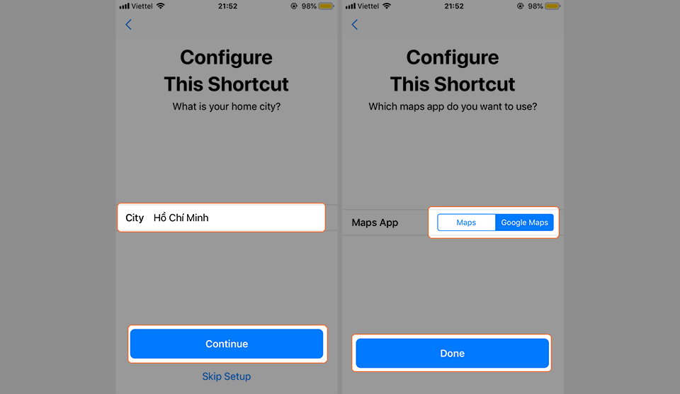 Bước 3: Tiếp theo hãy nhập thành phố bạn đang ở và chọn Continue > Thiết lập cuối cùng là chọn bản đồ sẽ sử dụng để chỉ đường, tùy theo thói quen sử dụng mà bạn sẽ chọn Apple Maps hoặc Google Maps.
