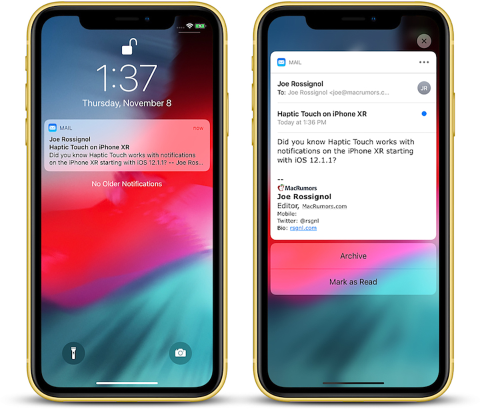 Một trong những điểm khác biệt nhỏ giữa iPhone XS và iPhone XR đó là iPhone XR không có 3D Touch mà thay vào đó là Haptic Toch. Tuy nhiên nó còn khá hạn chế, và với iOS 12.1.1 sắp tới Haptic Touch sẽ cung cấp thêm các tính năng mở rộng thông báo của bạn cho người dùng iPhone XR.